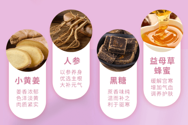 根據(jù)東方女性身體寒涼狀況,特別研發(fā)這款溫補(bǔ)姜茶。除日常配方中的黑糖和小黃姜外,添加了人參、枸杞、橘皮、益母草蜂蜜等各類溫補(bǔ)食材,熬制成人參姜母暖暖茶,暖身同時(shí)更注重日常溫補(bǔ)。